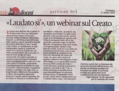 Articolo di A. Passoni sulla Giornata diocesana del Creato il Tavolo della Diocesi di Bologna per la custodia del Creato propone un webinar il 14-10-2020. Partecipa S. Em. Card. M.M. Zuppi. arcivescovo di Bologna. Intervengono S. Falasca, L. Meozzi. Coordina don D. Baraldi.