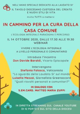 “In cammino per la cura della casa comune” :è il titolo dell’incontro organizzato dal Tavolo diocesano per la custodia del creato (14-10-2020). Interviene S. Em. Card. M. M. Zuppi arcivescovo di Bologna
